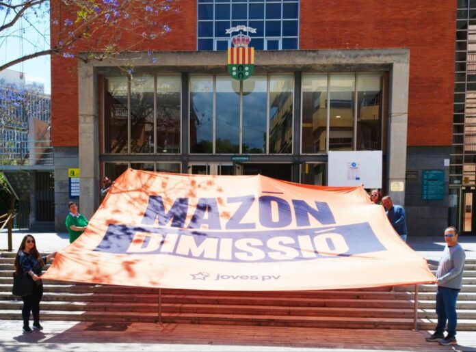 Mazón dimisión. Con estas dos palabras que se están repitiendo cada día en todos los pueblos y ciudades, Compromís ha desplegado una pancarta a las puestas del Auditorio municipal de Sant Vicent para mostrar su más profundo rechazo a las políticas que está llevando a cabo el actual Consell de la Generalitat Valenciana.